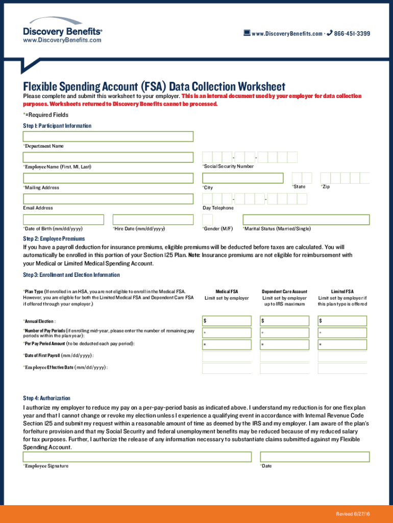 WWW.DiscoveryBenefits.com www.DiscoveryBenefits.com8664513399Flexible Spending Account (FSA) Data Collection WorksheetPlease complete and submit this worksheet to your employer. This is an internal