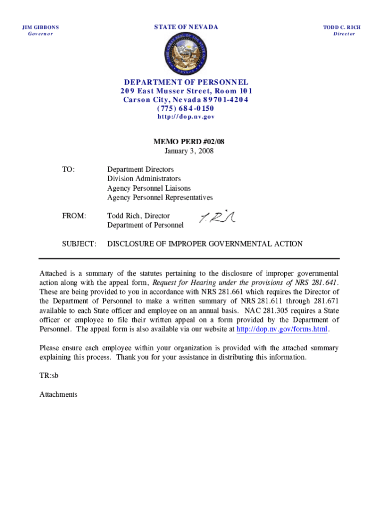 STATE OF NEVADA GIBBONS GovernorTODD C. RICH DirectorDEPARTMENT OF PERSONNEL 209 East Muster Street, Room 101 Carson City, Nevada 897014204 (775) 6840150 http://dop.nv.govMEMO PER #02/08 January 3,