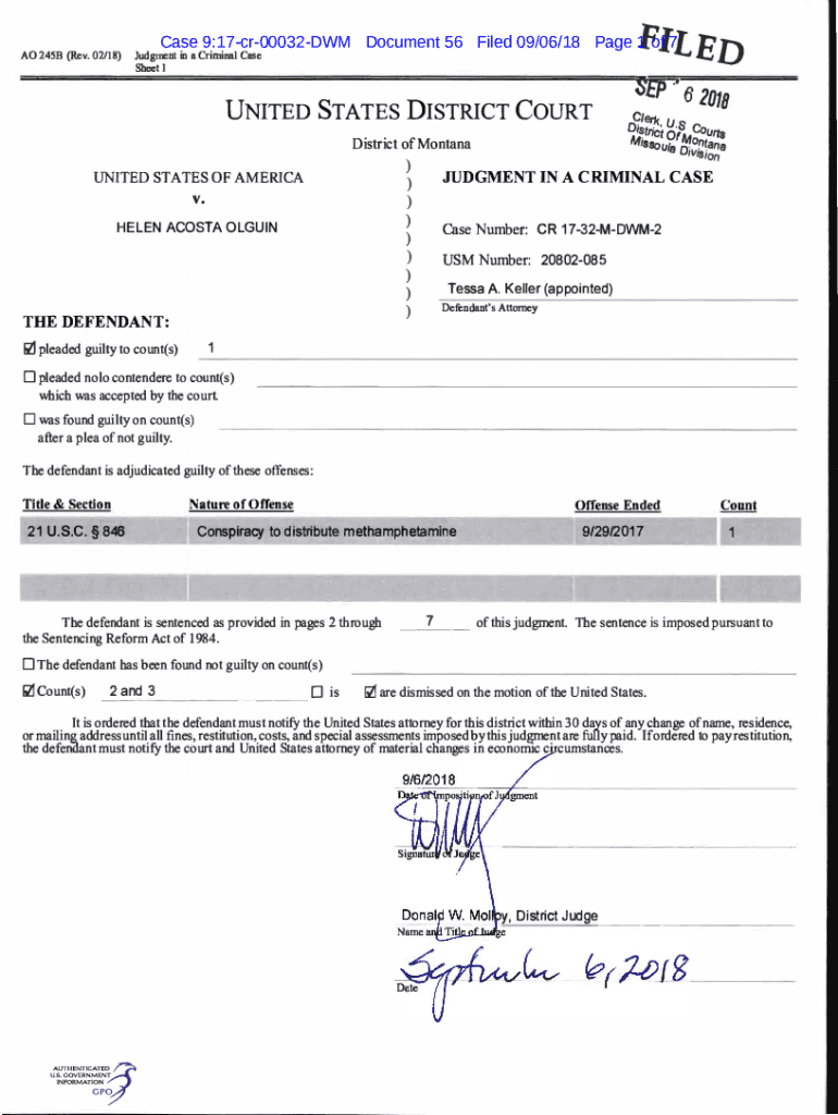 AO 245B (Rev. 02/18)FILED Case 9:17cr00032DWM Document 56 Filed 09/06/18-Page 1 of 7Judgment in a Criminal Case Sheet United STATES DISTRICT COURT District of Montana)))))))))UNITED STATES OF American.