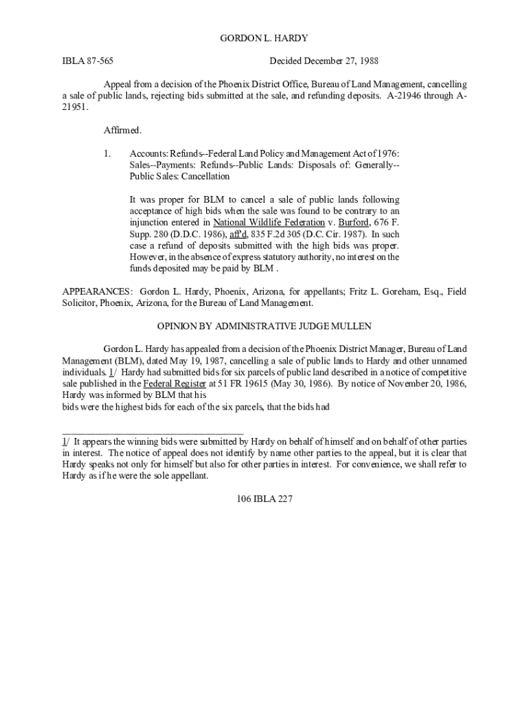 GORDON L. HARDY BLA 87565Decided December 27, 1988Appeal from a decision of the Phoenix District Office, Bureau of Land Management, cancelling a sale of public lands, rejecting bids submitted at the