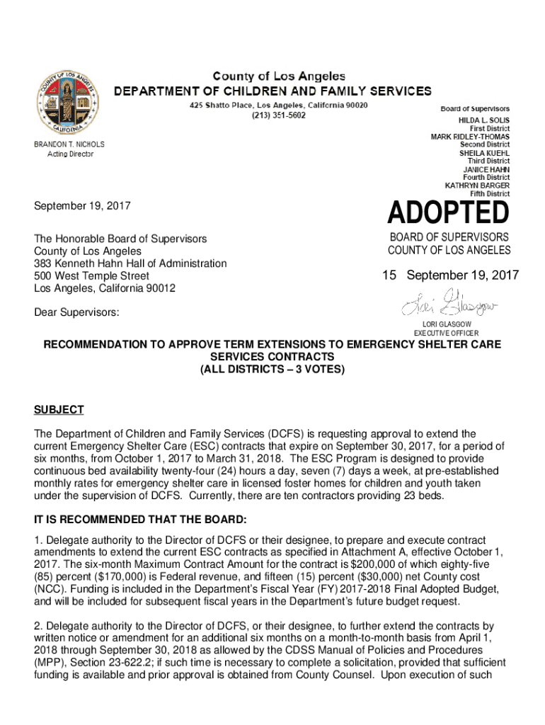 September 19, 2017, The Honorable Board of Supervisors County of Los Angeles 383 Kenneth Hahn Hall of Administration 500 West Temple Street Los Angeles, California 90012ADOPTEDBOARD OF SUPERVISORS
