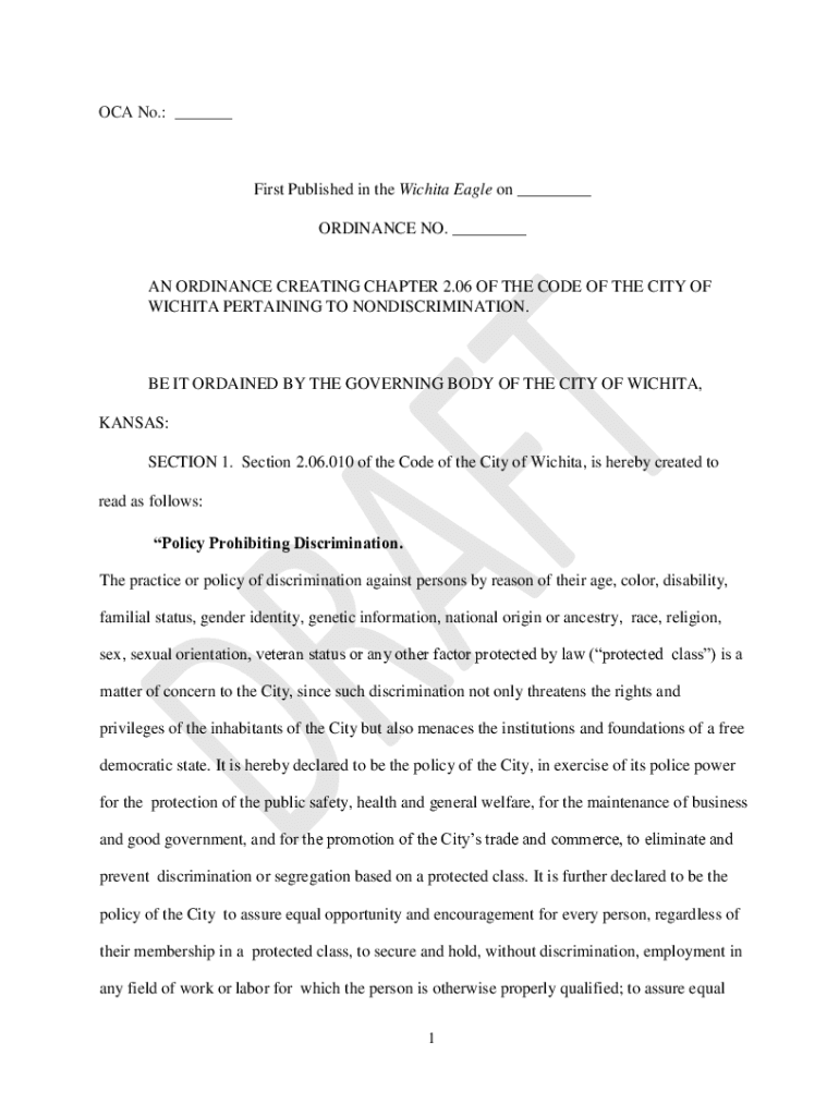 OCT No.: First Published in the Wichita Eagle on ORDINANCE NO. AN ORDINANCE CREATING CHAPTER 2.06 OF THE CODE OF THE CITY OF WICHITA PERTAINING TO NONDISCRIMINATION.BE IT ORDAINED BY THE GOVERNING