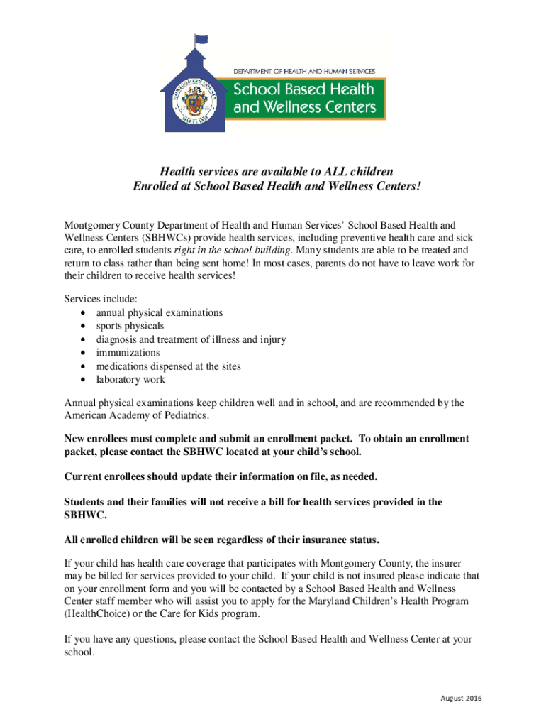 Health services are available to ALL children Enrolled at School Based Health and Wellness Centers! Montgomery County Department of Health and Human Services School Based Health and Wellness Centers