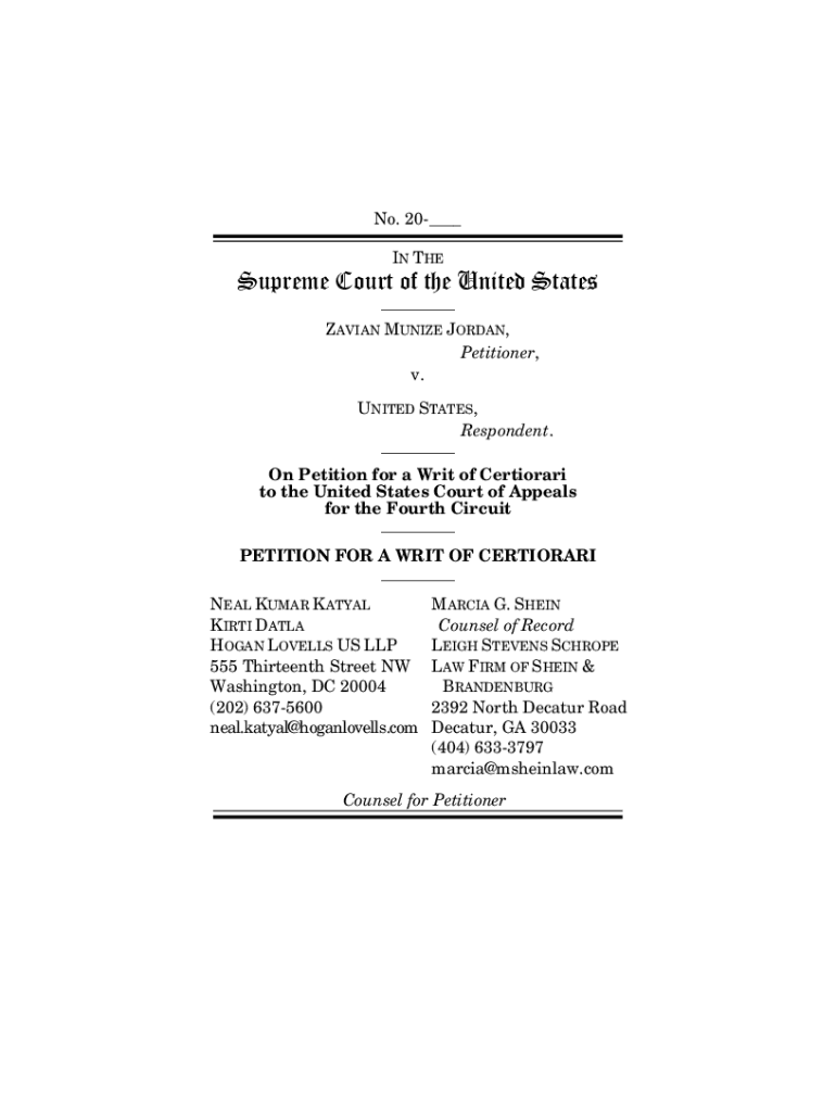 No. 20 IN Supreme Court of the United States AVIAN MUNICH JORDAN, Petitioner, v. UNITED STATES, Respondent. On Petition for a Writ of Certiorari to the United States Court of Appeals for the Fourth