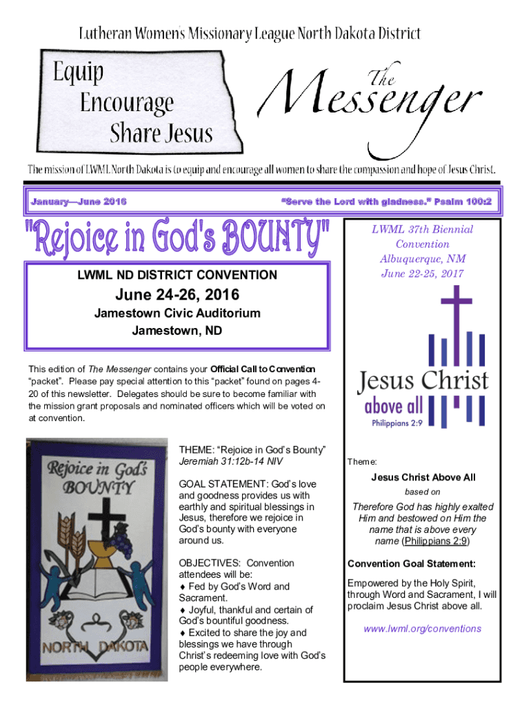 Jan/Feb/March 2013JanuaryJune 2016Serve the Lord with gladness. Psalm 100:2LWML ND DISTRICT CONVENTIONAL 37th Biennial Convention Albuquerque, NM June 2225, 2017June 2426, 2016 Jamestown Civic Auditorium