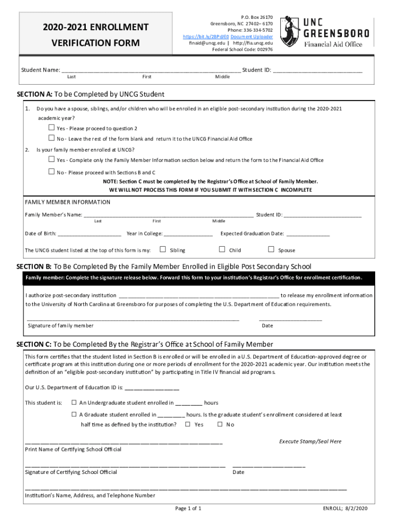 P.O. Box 26170 Greensboro, NC 27402 6170 Phone: 3363345702 https://bit.ly/2BPdJE0 Document Uploader fin aid UNC.edu http://fia.uncg.edu Federal School Code: 00297620202021 ENROLLMENT VERIFICATION