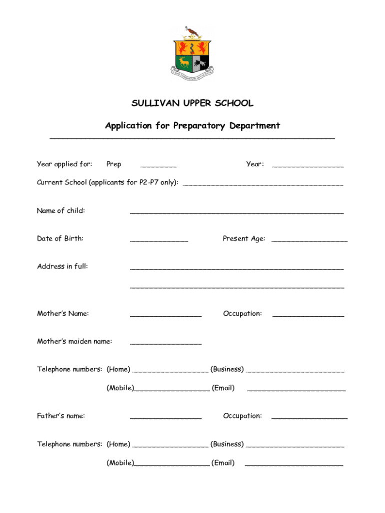 SULLIVAN UPPER SCHOOL Application for Preparatory Department Year applied for:Prep Year: Current School (applicants for P2P7 only): Name of child: Date of Birth: Address in full: Present Age: Mothers