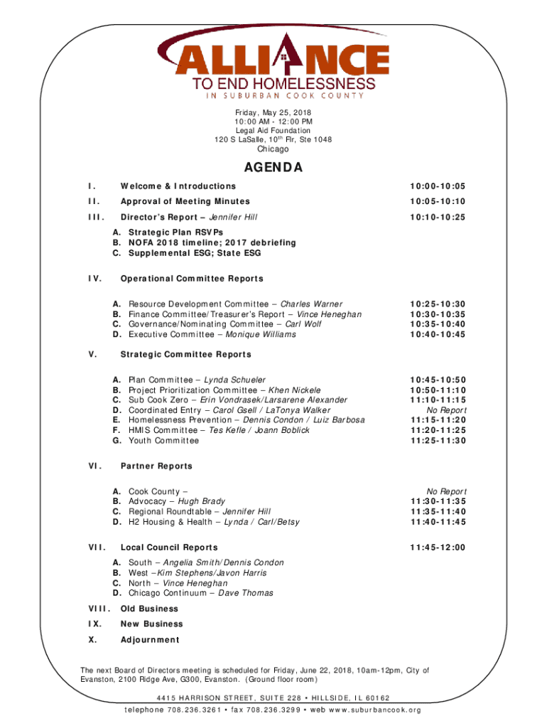 Friday, May 25, 2018 10:00 AM 12:00 PM Legal Aid Foundation 120 S Basally, 10th FLR, Ste 1048ChicagoAGENDA I. Welcome & Introductions10:0010:05II. Approval of Meeting Minutes10:0510:10III. Directors