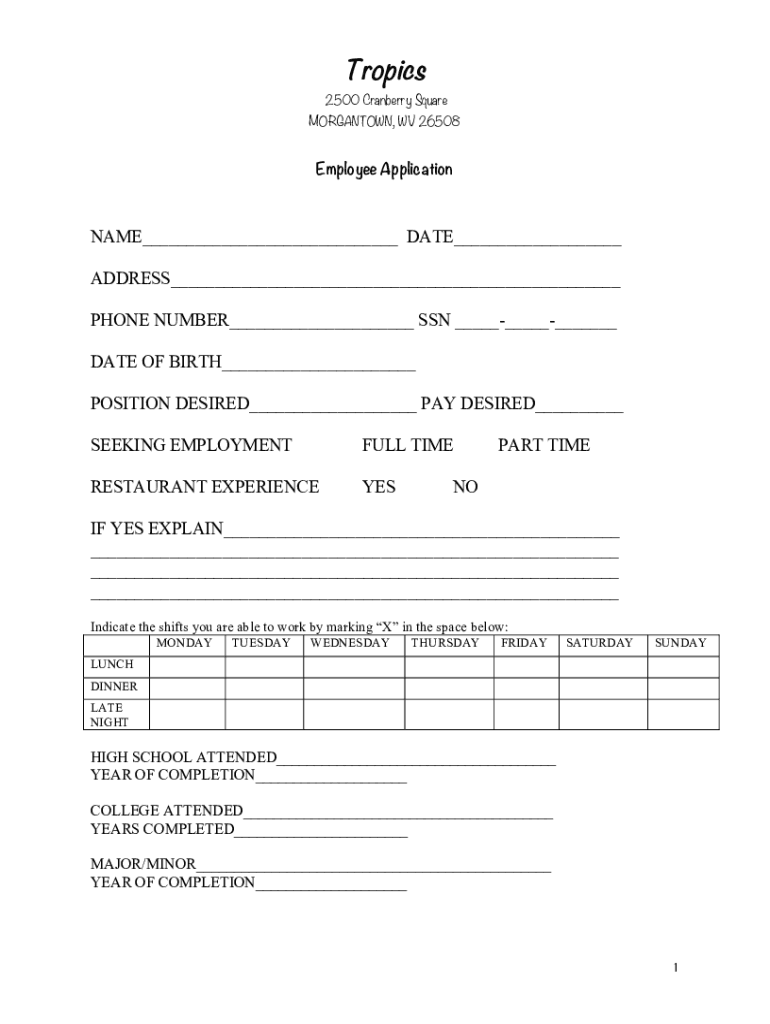 Tropics 2500 Cranberry Square MORGANTOWN, WV 26508Employee ApplicationNAME DATE ADDRESS PHONE NUMBER SSN DATE OF BIRTH POSITION DESIRED PAY DESIRED SEEKING EMPLOYMENTFULL TIMERESTAURANT EXPERIENCEYESPART