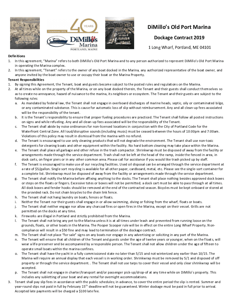 Mills Old Port Marina Dock age Contract 2019 1 Long Wharf, Portland, ME 04101 Definitions 1. In this agreement, Marina refers to both Mills Old Port Marina and to any person authorized to represent