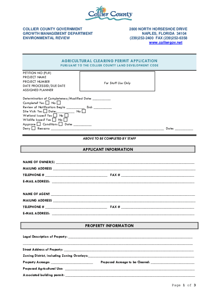 COLLIER COUNTY GOVERNMENT GROWTH MANAGEMENT DEPARTMENT ENVIRONMENTAL REVIEW2800 NORTH HORSESHOE DRIVE NAPLES, FLORIDA 34104 (239)2522400 FAX (239)2526358 www.colliergov.netAGRICULTURAL CLEARING PERMIT