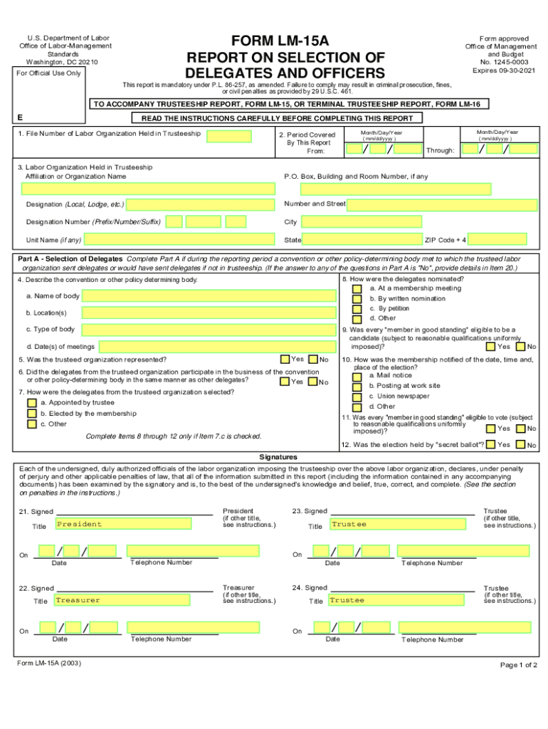 U.S. Department of Labor Office of LaborManagement Standards Washington, DC 20210Form approved Office of Management and Budget No. 12450003 Expires 09302021FORM LM15A REPORT ON SELECTION OF DELEGATES