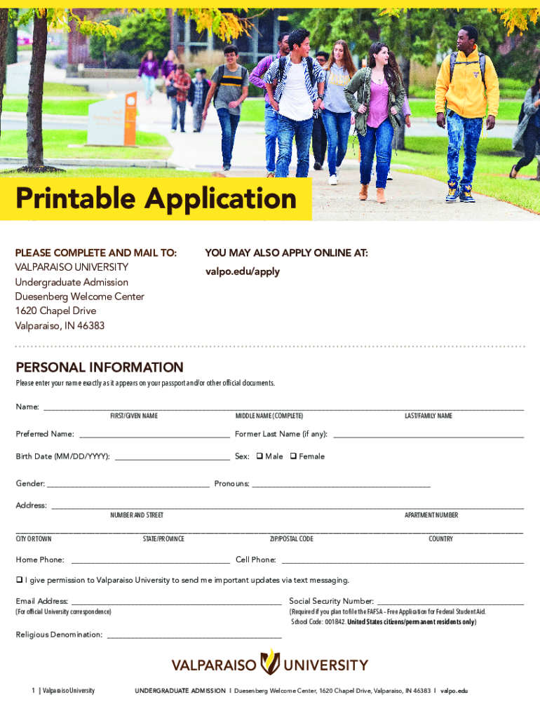 Printable Application PLEASE COMPLETE AND MAIL TO: VALPARAISO UNIVERSITY Undergraduate Admission Rosenberg Welcome Center 1620 Chapel Drive Valparaiso, IN 46383YOU MAY ALSO APPLY ONLINE AT: valpo.edu/applyPERSONAL