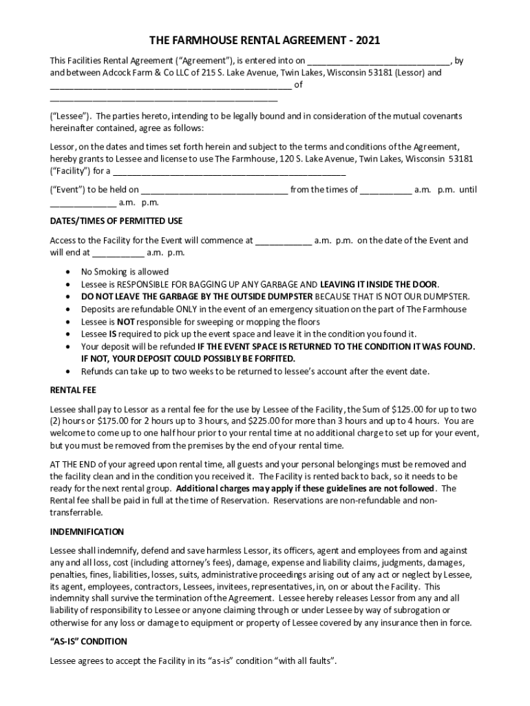 THE FARMHOUSE RENTAL AGREEMENT 2021 This Facilities Rental Agreement (Agreement), is entered into on, by and between Ad cock Farm & Co LLC of 215 S. Lake Avenue, Twin Lakes, Wisconsin 53181 (Lessor)