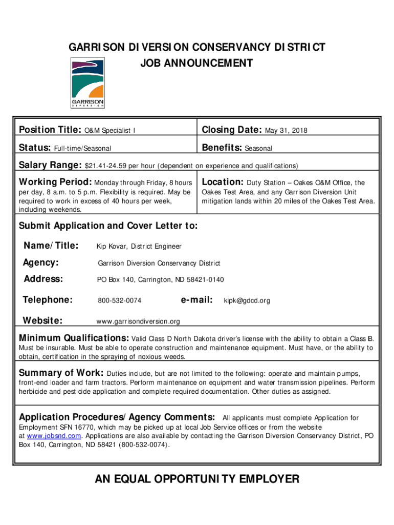 GARRISON DIVERSION CONSERVANCY DISTRICT JOB ANNOUNCEMENTPosition Title:Closing Date:O&M Specialist Status: Full time/Seasonal Salary Range:May 31, 2018Benefits: Seasonal$21.4124.59 per hour (dependent