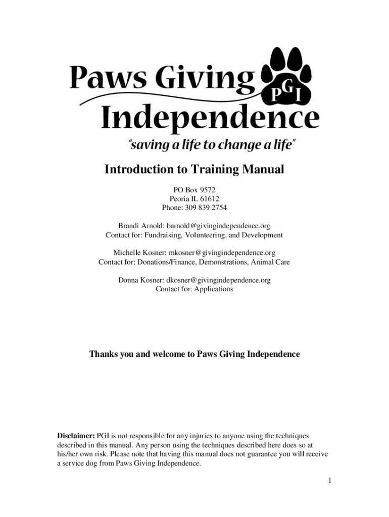 Introduction to Training Manual PO Box 9572 Peoria IL 61612 Phone: 309 839 2754 Brandi Arnold: barnold@givingindependence.org Contact for: Fundraising, Volunteering, and Development Michelle Kosher: