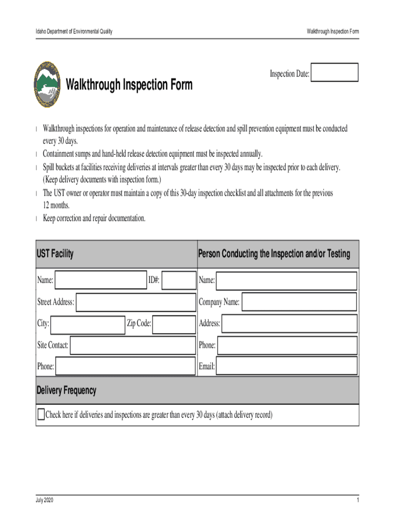 Idaho Department of Environmental QualityWalkthrough Inspection FormInspection Date:Walkthrough Inspection Form ll walkthrough inspections for operation and maintenance of release detection and spill
