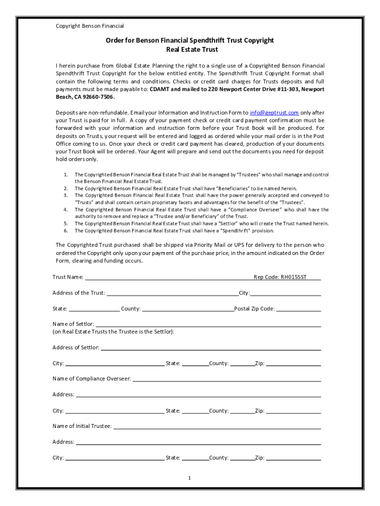 Copyright Benson FinancialOrder for Benson Financial Spendthrift Trust Copyright Real Estate Trust I herein purchase from Global Estate Planning the right to a single use of a Copyrighted Benson Financial