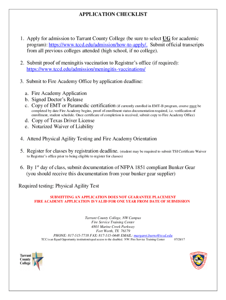 APPLICATION CHECKLIST1. Apply for admission to Tarrant County College (be sure to select UG for academic program): https://www.tccd.edu/admission/howtoapply/. Submit official transcripts from all