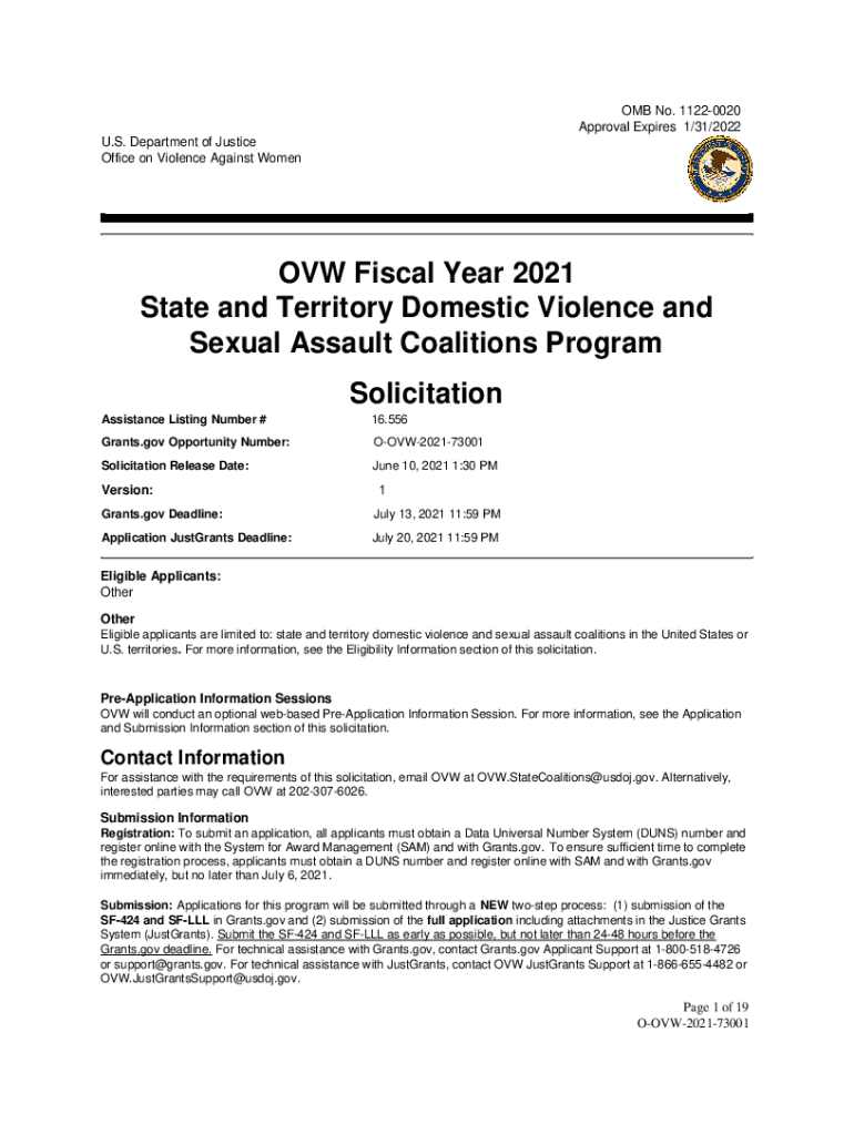 OMB No.11220020 Approval Expires 1/31/2022 U.S. Department of Justice Office on Violence Against Women Fiscal Year 2021 State and Territory Domestic Violence and Sexual Assault Coalitions Program