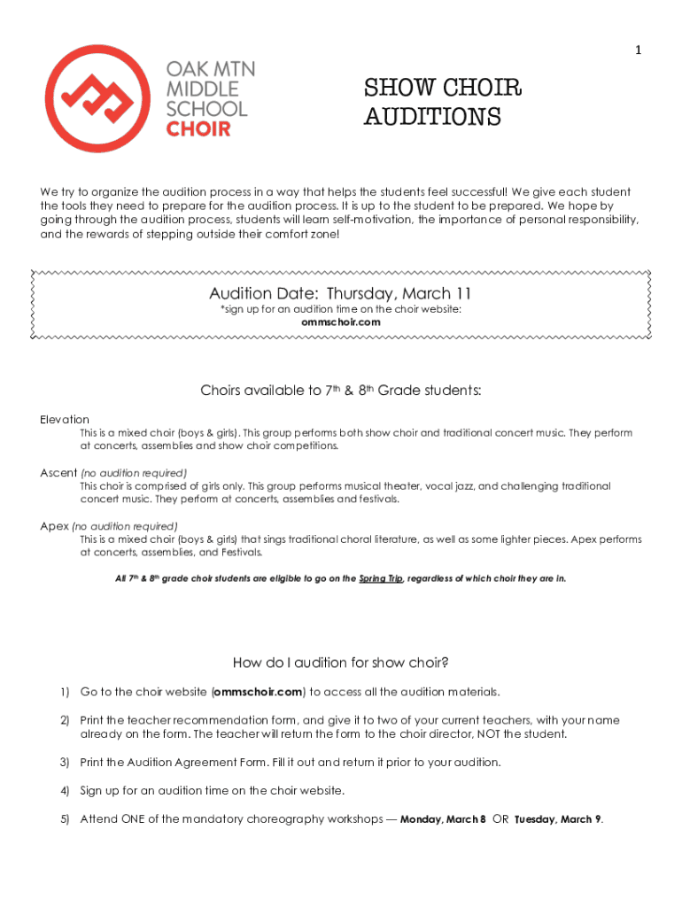1SHOW CHOIR AUDITIONS We try to organize the audition process in a way that helps the students feel successful! We give each student the tools they need to prepare for the audition process. It is