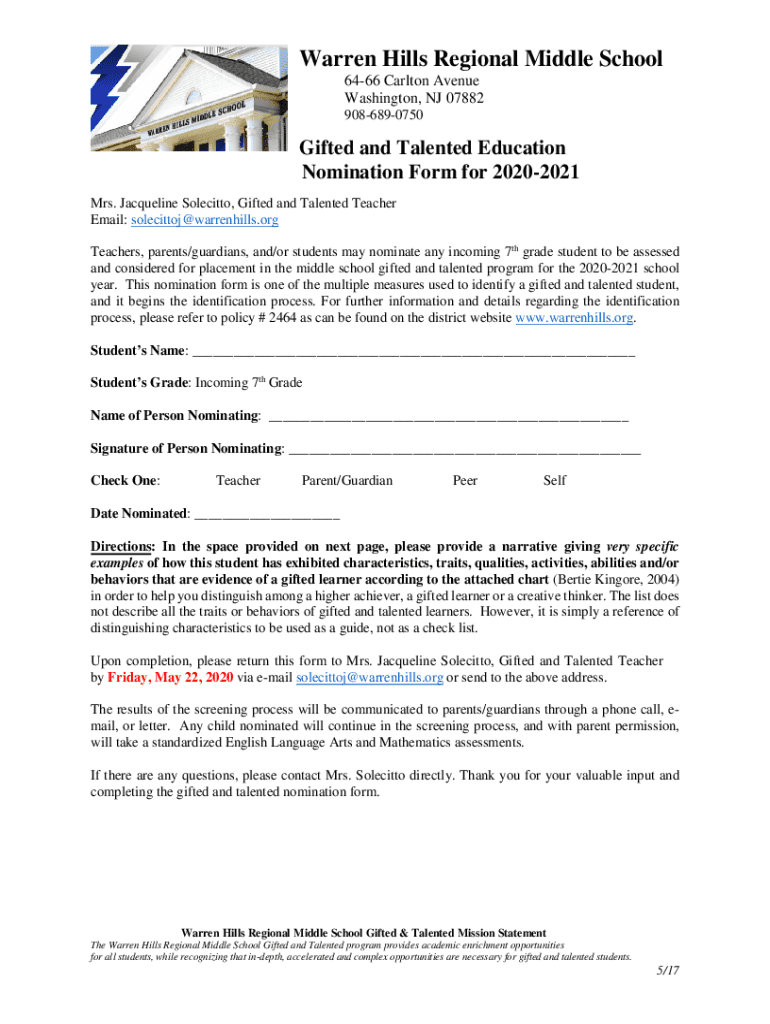 Warren Hills Regional Middle School 6466 Carlton Avenue Washington, NJ 07882 9086890750Gifted and Talented Education Nomination Form for 20202021 Mrs. Jacqueline Solicitor, Gifted and Talented Teacher