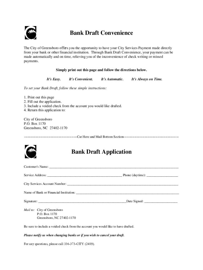 Bank Draft Convenience The City of Greensboro offers you the opportunity to have your City Services Payment made directly from your bank or other financial institution. Through Bank Draft Convenience,