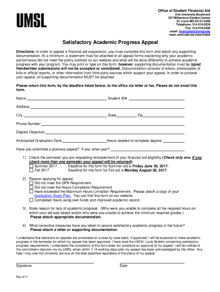 Office of Student Financial Aid One University Boulevard 327 Millennium Student Center St. Louis MO 631214499 Telephone: 3145165526 Fax: 3145165408 email: financialaid@umsl.edu www.umsl.edu/services/finaidSatisfactory