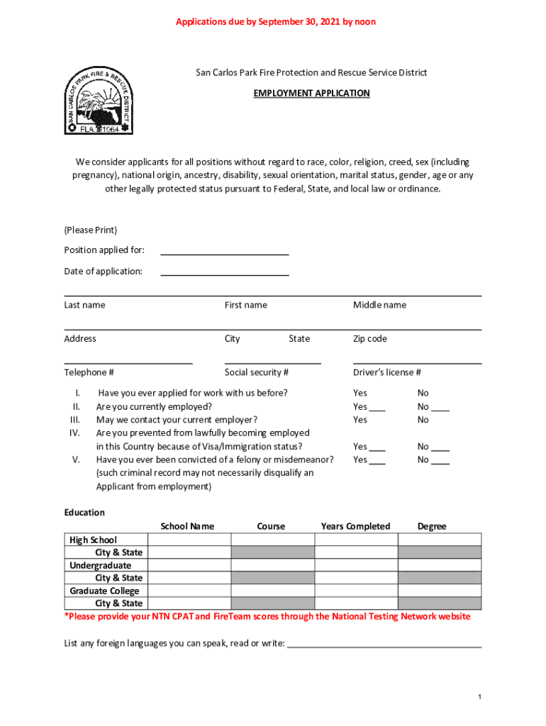 Applications due by September 30, 2021, by noon San Carlos Park Fire Protection and Rescue Service District EMPLOYMENT Application consider applicants for all positions without regard to race, color,
