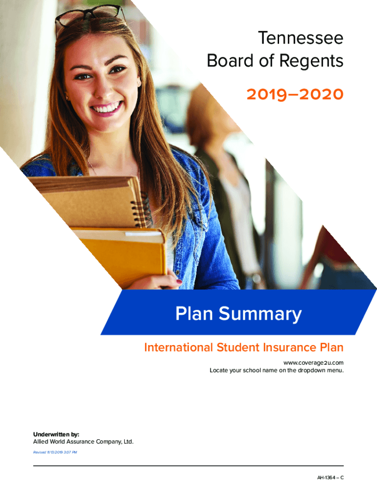 Tennessee Board of Regents 20192020Plan Summary International Student Insurance Plan www.coverage2u.com Locate your school name on the dropdown menu. Underwritten by: Allied World Assurance Company,