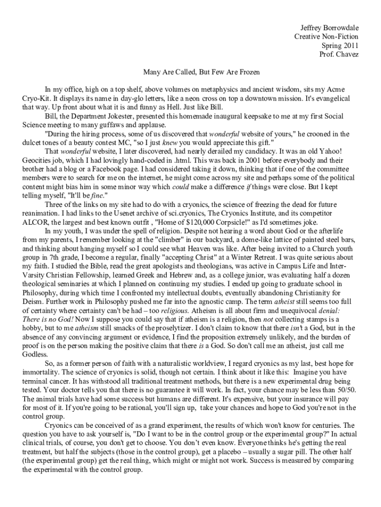 Jeffrey Borrow dale Creative Nonfiction Spring 2011 Prof. Chavez Many Are Called, But Few Are Frozen In my office, high on a top shelf, above volumes on metaphysics and ancient wisdom, sits my Acme