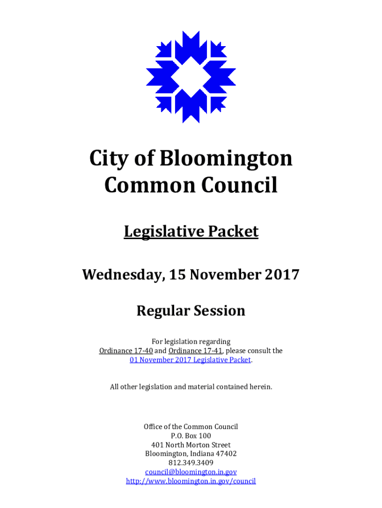 City of Bloomington Common Council Legislative Packet Wednesday, 15 November 2017 Regular Session For legislation regarding Ordinance 1740 and Ordinance 1741, please consult the 01 November 2017 Legislative