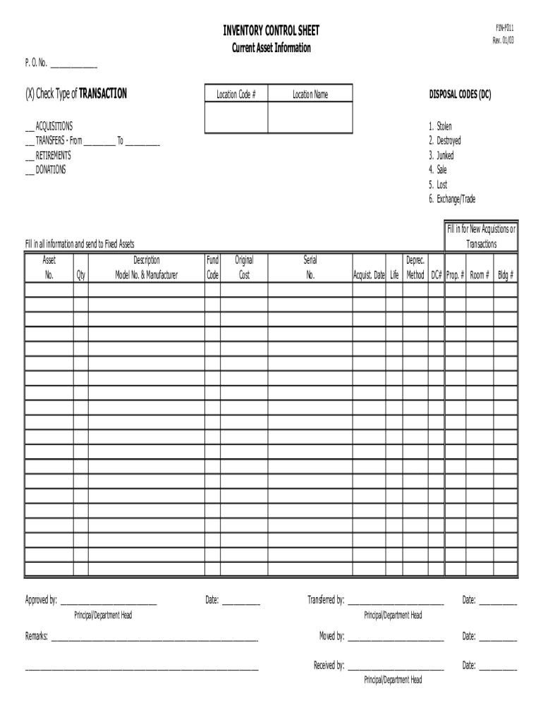 INVENTORY CONTROL SHEETFINF011 Rev. 01/03Current Asset Information P. O. No. (X) Check Type of TRANSACTION Location Code #Location NameDISPOSAL CODES (DC)ACQUISITIONS TRANSFERS From To RETIREMENTS