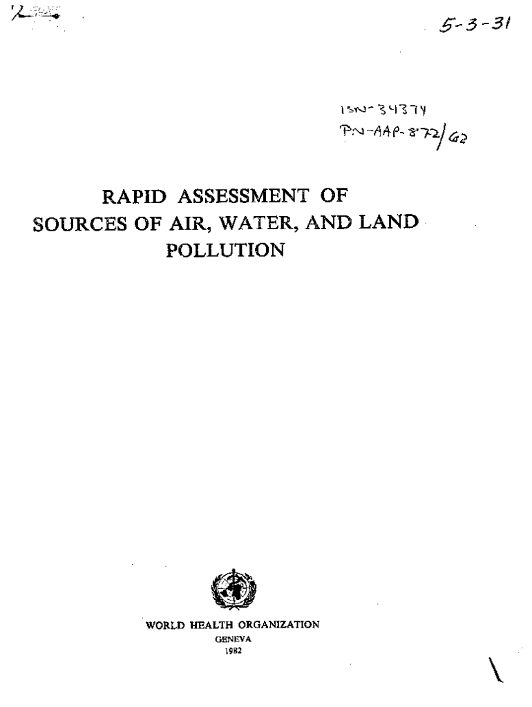 RAPID ASSESSMENT SOURCES OF AIR, WATER, AND LANDPOLLUTIONWORLD HEALTH ORGANIZATION GENEVA1982WHO Offset Publication No. 62WHO offset publications are intended to make generally available material