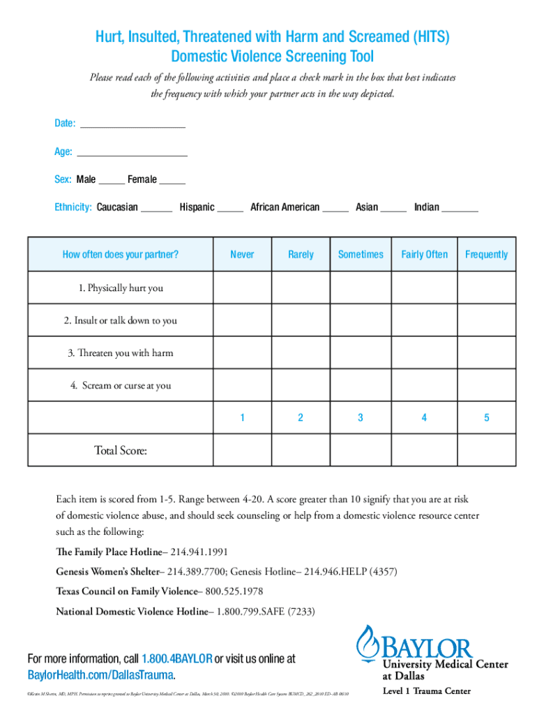 Hurt, Insulted, Threatened with Harm and Screamed (HITS) Domestic Violence Screening Tool Please read each of the following activities and place a check mark in the box that best indicates the frequency