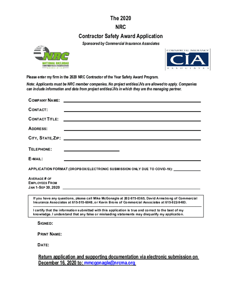 The 2020 NRC Contractor Safety Award Application Sponsored by Commercial Insurance AssociatesPlease enter my firm in the 2020 NRC Contractor of the Year Safety Award Program. Note: Applicants must