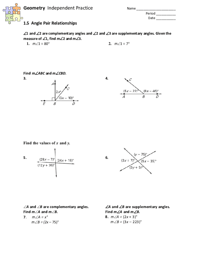 Geometry Independent PracticeName Period Date 1.5 Angle Pair Relationships 1 and 2 are complementary angles and 2 and 3 are supplementary angles. Given the measure of 1, find m2 and m3. 1. m1 80 2.
