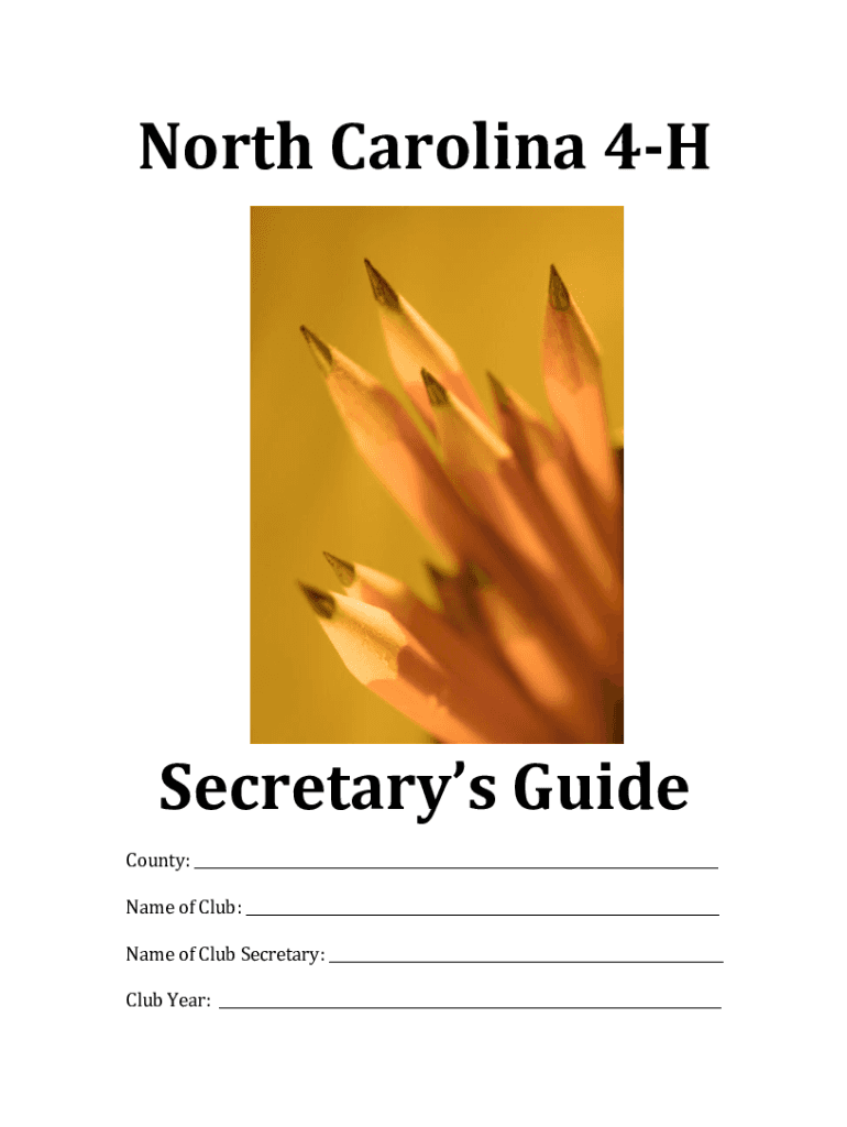 North&Carolina&4H&Secretarys&Guide&! County:! ! ! Name!of! Club:! ! ! Name!of! Club! Secretary:! ! ! Club! Year:!! Dear! Club!secretary, Congratulations!! You!have!been!elected!to!serve!as!your!clubs!secretary!