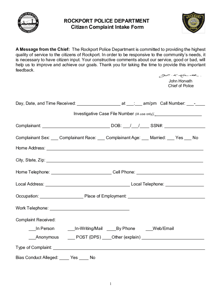 Get the free ROCKPORT POLICE DEPARTMENT Citizen Complaint Intake Form