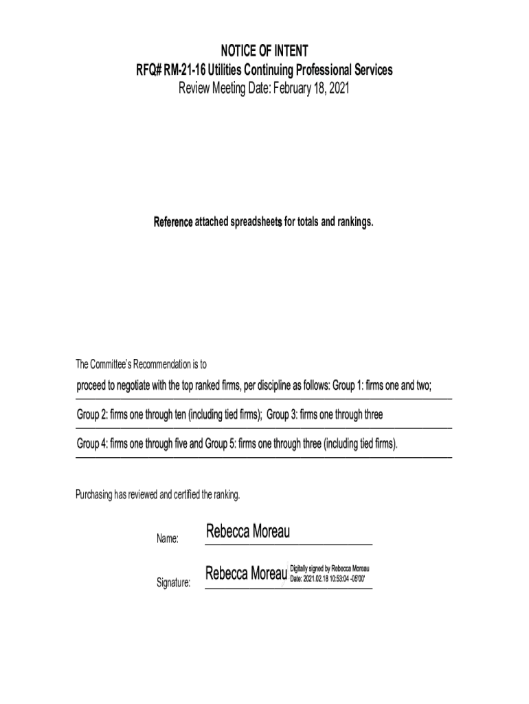 NOTICE OF INTENT RFQ# RM2116 Utilities Continuing Professional Services Review Meeting Date: February 8, 2021attached spreadsheet for totals and rankings. The Committees Recommendation is Purchasing
