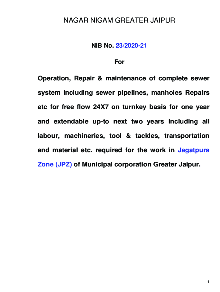 NAGAR NI GAM GREATER JAIPUR No. 23/202021 For Operation, Repair & maintenance of complete sewer system including sewer pipelines, manholes Repairs etc for free flow 24 7 on turnkey basis for one year