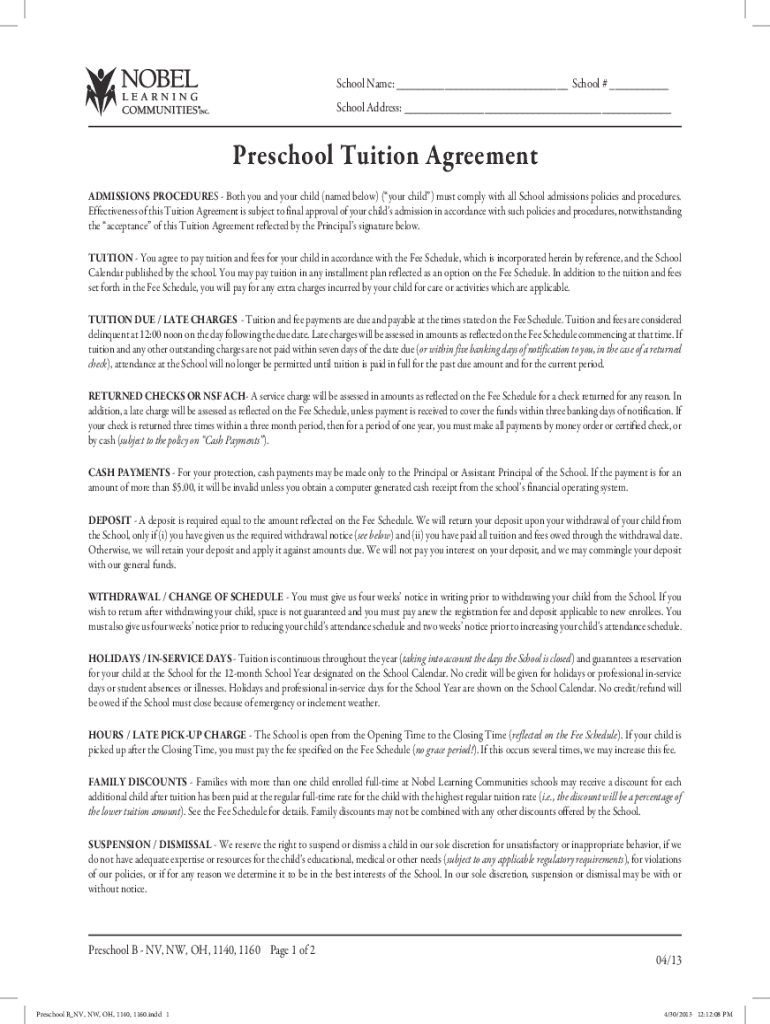 School Name: School # School Address: Preschool Tuition Agreement ADMISSIONS PROCEDURES Both you and your child (named below) (your child) must comply with all School admissions policies and procedures.