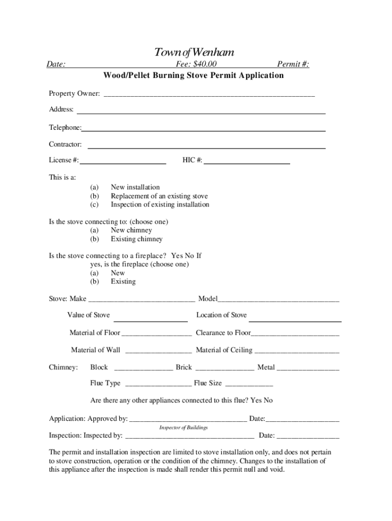 Town of Wen ham Date:Fee: $40.00 Permit #: Wood/Pellet Burning Stove Permit ApplicationProperty Owner: Address: Telephone: Contractor: License #:HIC #:This is a: (a) (b) (c)New installation Replacement