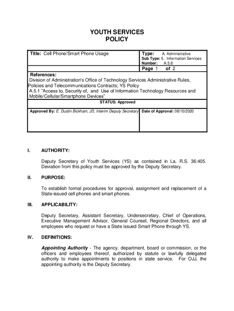 YOUTH SERVICES POLICY Title: Cell Phone/Smartphone UsageType: A. Administrative Sub Type: 5. Information Services Number: A.5.8 Page 1of 2References: Division of Administration\'s Office of Technology