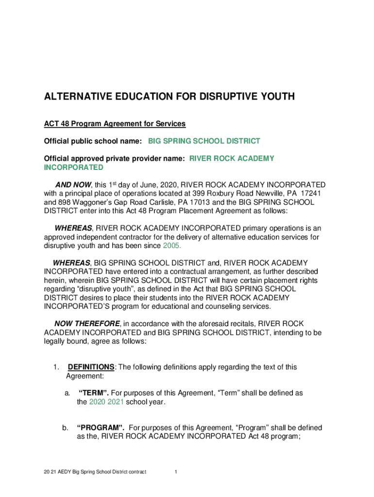 ALTERNATIVE EDUCATION FOR DISRUPTIVE YOUTH ACT 48 Program Agreement for Services Official public school name: BIG SPRING SCHOOL DISTRICT Official approved private provider name: RIVER ROCK ACADEMY