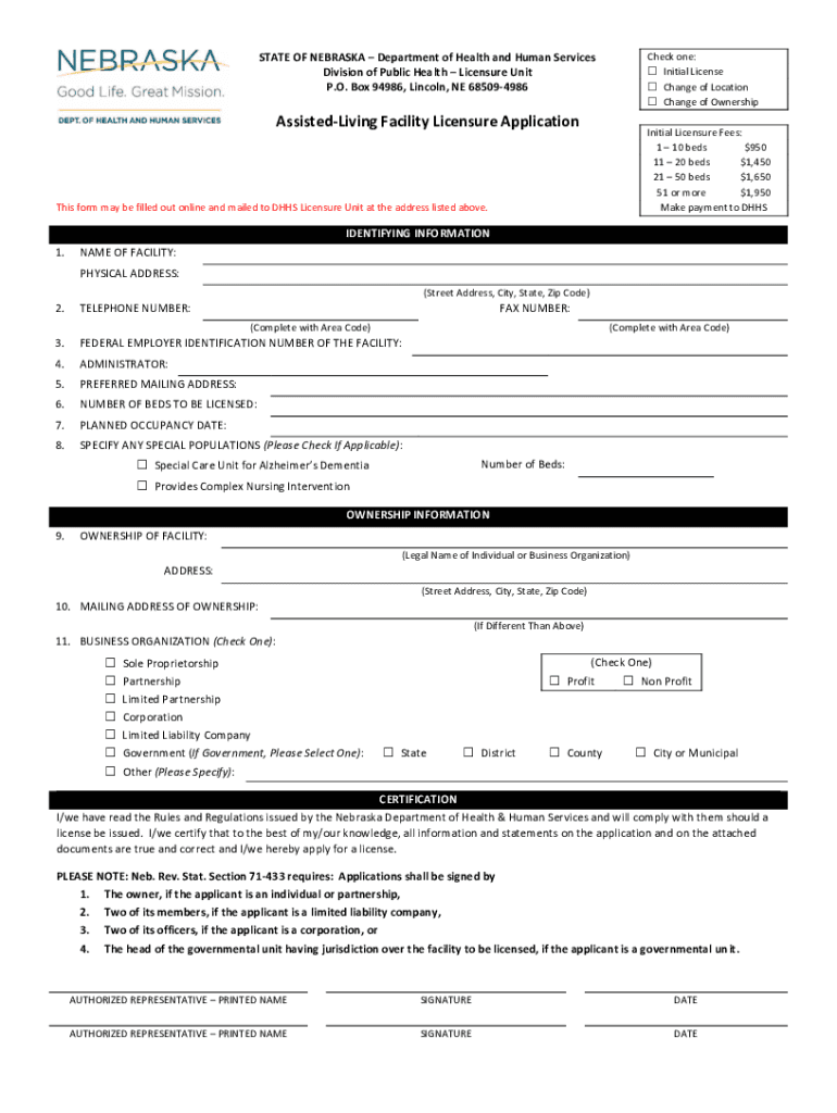 Check one: Initial License Change of Location Change of OwnershipSTATE OF NEBRASKA Department of Health and Human Services Division of Public Health Licensure Unit P.O. Box 94986, Lincoln, NE 685094986AssistedLiving