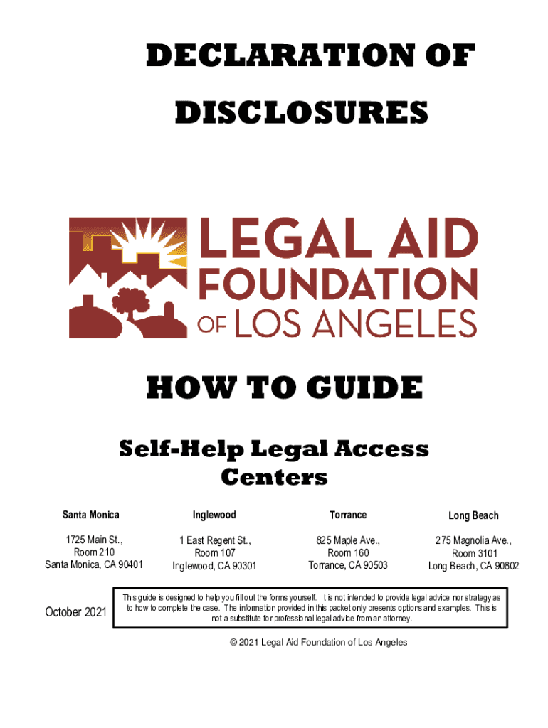 DECLARATION OF DISCLOSURES TO GUIDE Selfless Legal Access Centers Santa MonicaInglewoodTorranceLong Beach1725 Main St., Room 210 Santa Monica, CA 904011 East Regent St., Room 107 Inglewood, CA 90301825