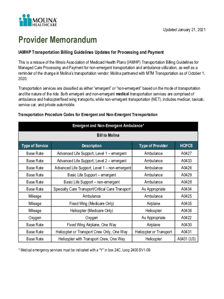 Updated January 21, 2021Provider Memorandum IA MHP Transportation Billing Guidelines Updates for Processing and Payment This is a reissue of the Illinois Association of Medicaid Health Plans (IA MHP)