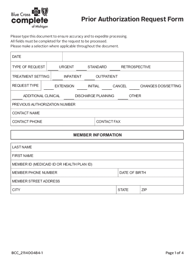 Prior Authorization Request Form Please type this document to ensure accuracy and to expedite processing. All fields must be completed for the request to be processed. Please make a selection where