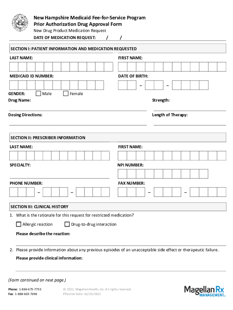 New Hampshire Medicaid FeeforService Program Prior Authorization Drug Approval Form New Drug Product Medication Request DATE OF MEDICATION REQUEST://SECTION I: PATIENT INFORMATION AND MEDICATION REQUESTED